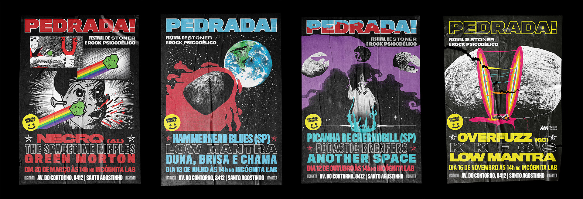 EN The Pedrada Festival! left its mark on Belo Horizonte with four editions (2017-2019) of pure stoner rock and psychedelic music, bringing together Brazilian underground bands in an authentic event Organized by Incógnita Cia. Cervejeira, the festival stood out for its music and its "do it yourself" visual identity, which reflected its spirit.